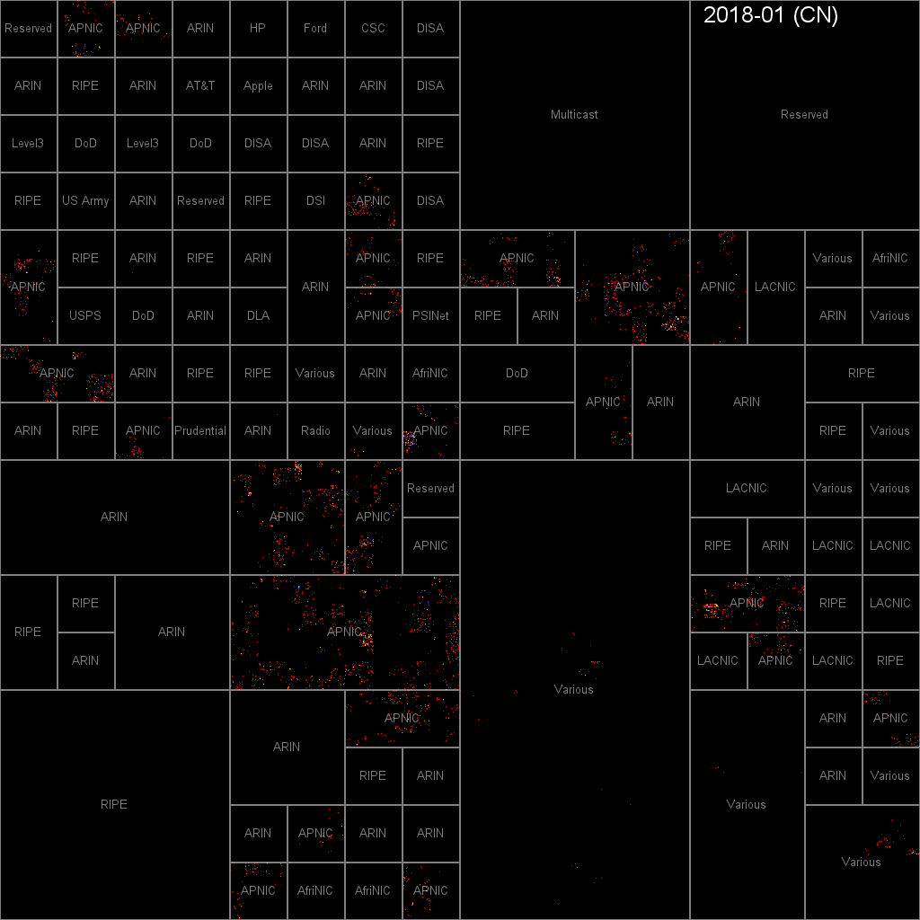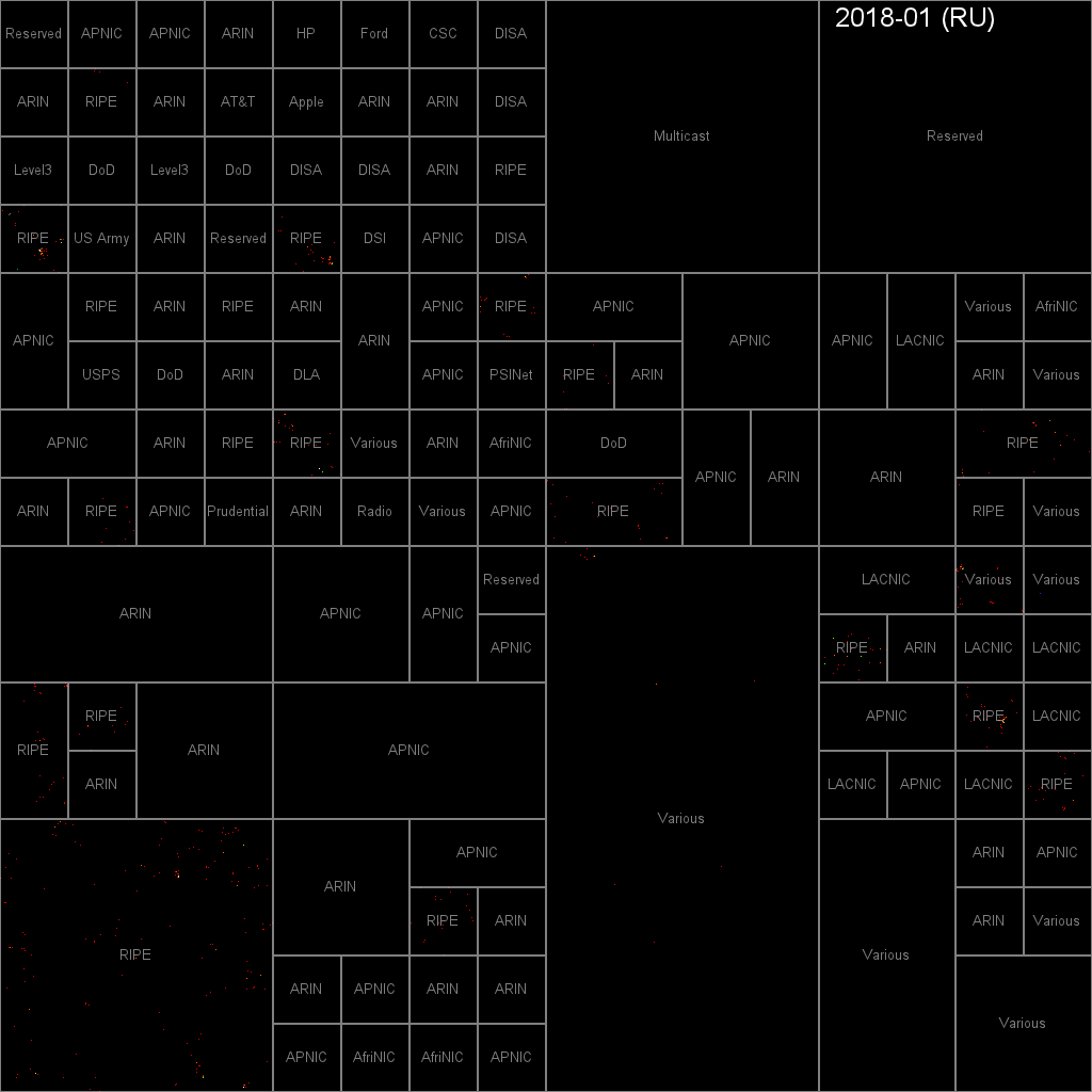 You can click on any of these pictures to see the full-sized map. In the full maps, each pixel represents a "/20" subnet -- that's 4,096 IPv4 addresses. Each colored pixel represents one or more attacks during the given month. (I'm using a rainbow heatmap: black=none, red, orange, yellow, ..., blue, white=max seen.)