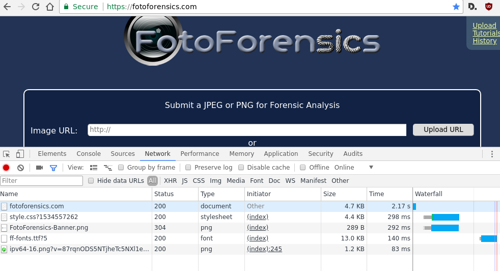 Then I looked at my web browser. With Chrome, you can press Control-Shift-i and pull up the developer panel. Then you can click on the "Network" tab and see all of the network requests. Here's what my FotoForensics service normally looks like: