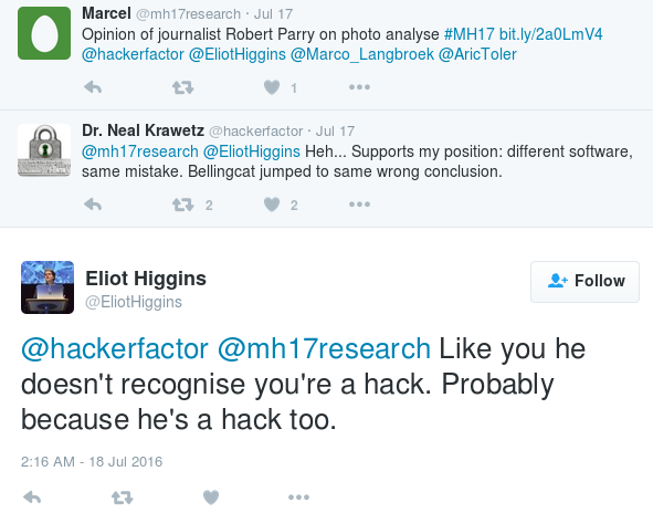 I find it odd that Eliot Higgins would call experts in the field and forensic tool developers "hacks". In my case, Bellingcat relied on my tools in an attempt to justify their conclusions, actively sought out my expert opinion, and then insulted me when my opinion differed from their desired result.