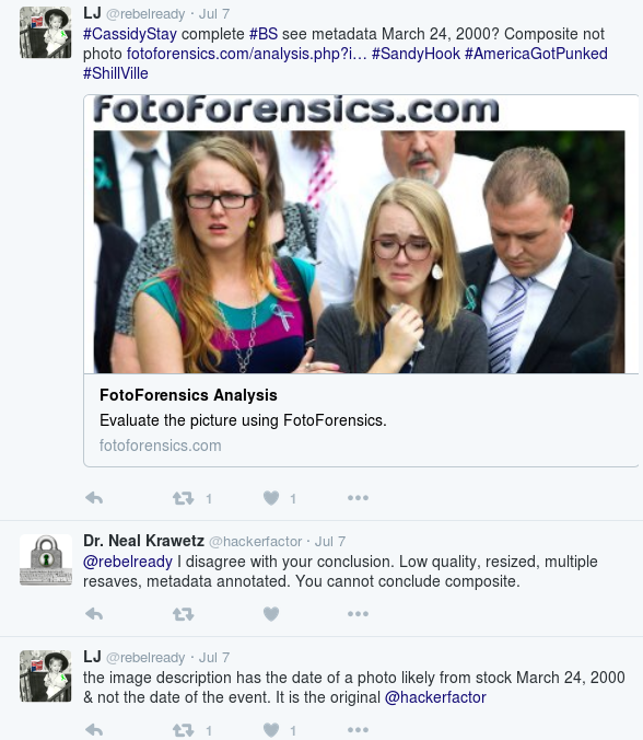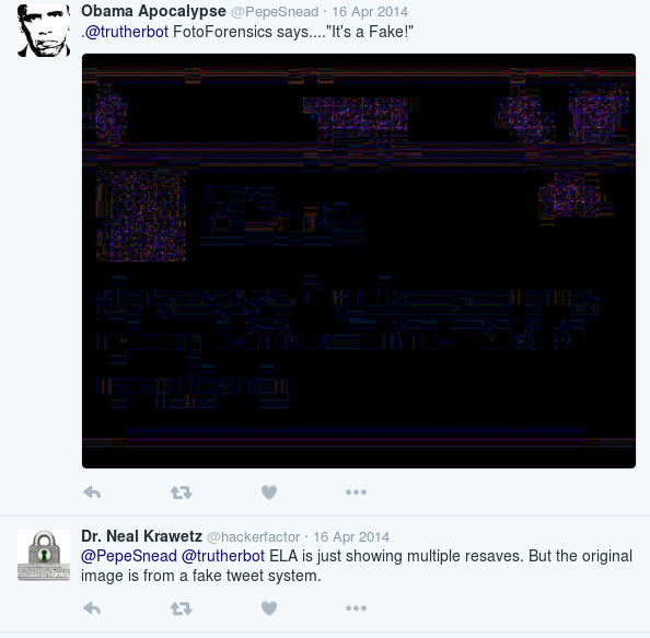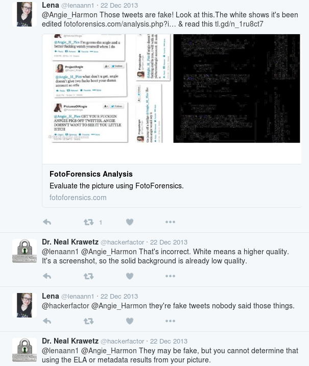 When I pointed out that the claim was incorrect, she fell back to stating that nobody said those things. We later determined that the account was active during those times, but did not appear to make those statements. However, finding out that the text is fake by looking up the timestamps on Twitter is not the same thing as using FotoForensics to identify an edited picture.
