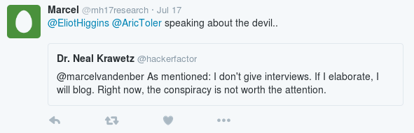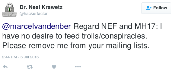 On 6-July-2016, I was contacted by a "freelance journalist" who asked me about NEF files. (NEF is the Nikon Raw format, based on TIFF.) Before responding to a stranger, I decided to look him up. The twitter profile for Marcel van den Berg identified him as part of the MH17 research community. I then checked if there was anything about NEF and MH17: someone claimed to have camera-original files related to some MH17 conspiracy, but was refusing to make them public.I chose (1) to not respond privately to Marcel, and (2) to decline his offer.