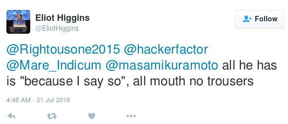 However, the insults did not just come from a reporter associated with this Bellingcat report. They also came from Bellingcat's founder, Eliot Higgins. For example:
