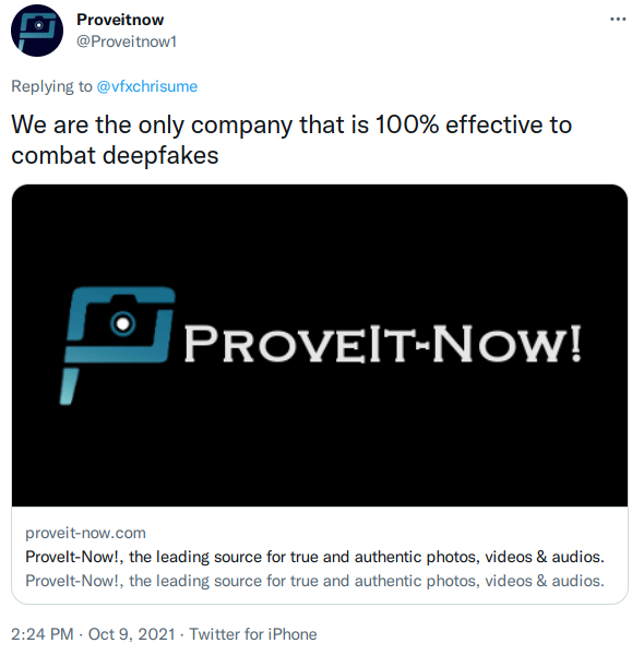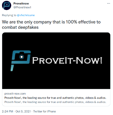 This investigation started with one incredible claim: "We are the only company that is 100% effective to combat deepfakes". This claim is provably false.- They are not the "only company" working in this field. There are dozens of other companies developing solutions for provenance tracking. In addition, there are large organizations working on developing standards for tracking provenance.