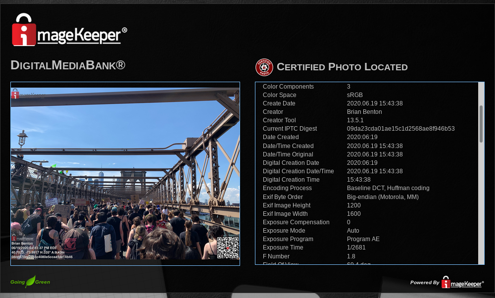 On one side, you see their annotated version of the image. On the other side, you see metadata and the words "Certified Photo Located".