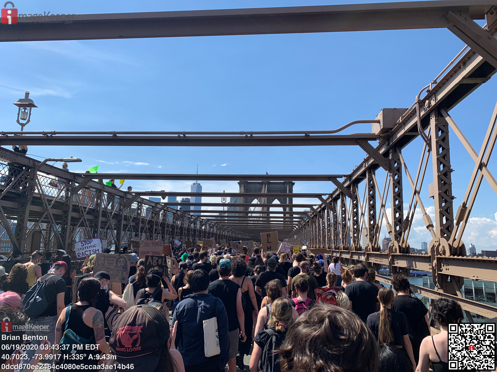- The altitude is not only inconsistent with the metadata, it's also inconsistent with the photo. The photo was taken on the Brooklyn Bridge. The bridge connects Brooklyn to New York. Using Google Street View, we can easily find this location. The average altitude of the bridge deck (where the people are walking) is 127 feet (38.7 meters) above the water. Visually, we can see that the camera is higher than the adjacent 6-story buildings; they are not at an altitude of 9 meters.