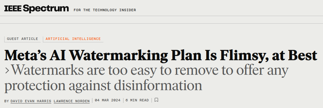 The first feedback I received mentioned a recent article (4-March-2024) at IEEE Spectrum. IEEE's David Evan Harris and Lawrence Norden reviewed Meta's proposed solution to AI-generated media. The article's title nailed the problem (their bold for emphasis):![]()