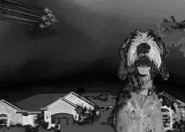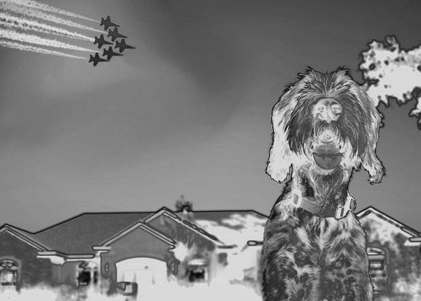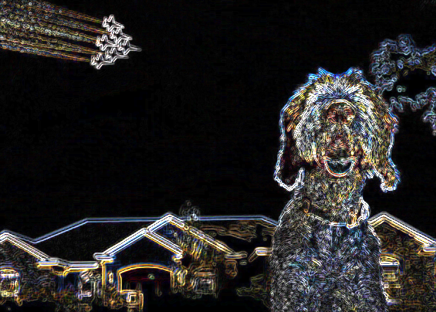 Taken without any context, the ELA for this image identifies the dog and jets as being at a higher error level potential (newer) than the rest of the image. However, this difference could be explained due to a combination of Photoshop and scaling. Photoshop attempts to counteract the JPEG losslessness by over-emphasizing high frequency areas. (See my Alyson Hannigan write-up.) This image does have a large amount of rainbowing (the red/blue/purple coloring), so this certainly matches the meta data that identified Photoshop. With scaling, every pixel is modified and high frequency areas (like the dog's fur) can have pixel values altered more than the rest of the image.