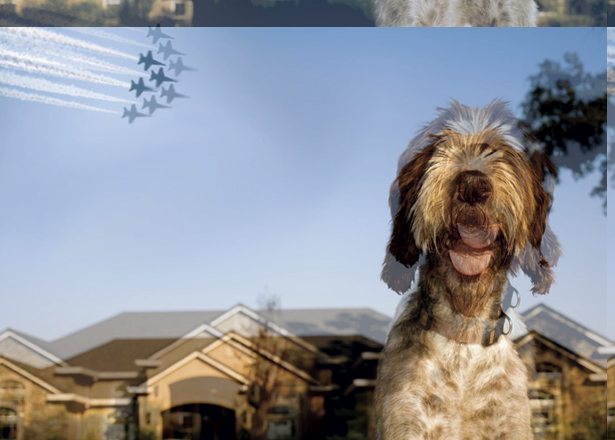In this case, the dog has a thin, black outline against the sky. He was spliced into the picture. It is a little more difficult to see, but the upper 4 jets also have thin black lines. They were pasted into the picture.