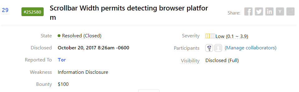 Over three years ago, I tried to report a vulnerability in the Tor Browser to the Tor Project. The bug is simple enough: using JavaScript, you can identify the scrollbar width. Each operating system has a different default scrollbar size, so an attacker can identify the underlying operating system. This is a distinct attribute that can be used to help uniquely track Tor users. (Many users think that Tor makes them anonymous. But Tor users can be tracked online; they are not anonymous.)