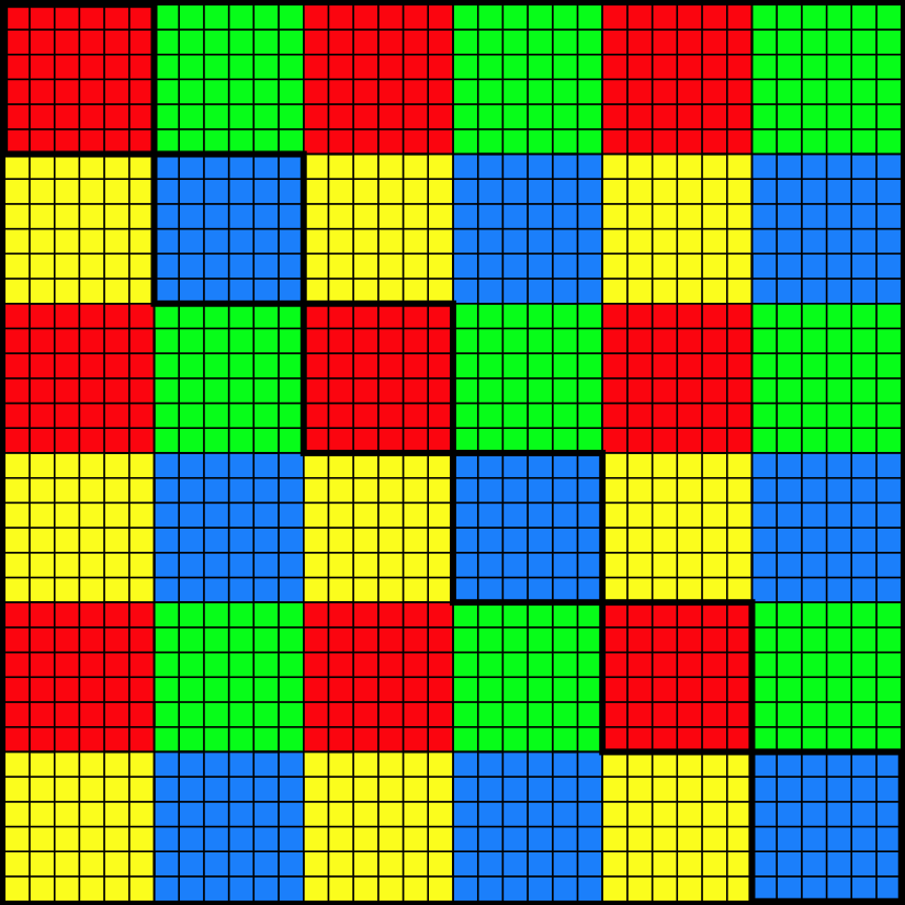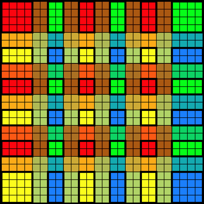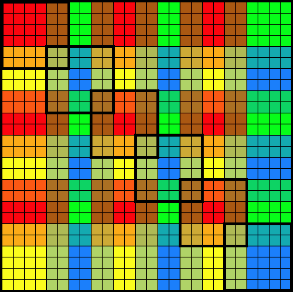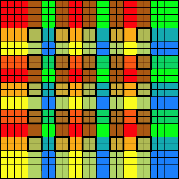 | This image shows the scaled down 36x36 "pixels" divided into 6x6 grids. Each grid has a color. The diagonal 6 grids are highlighted with a thick border. |